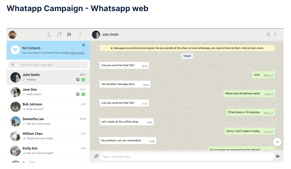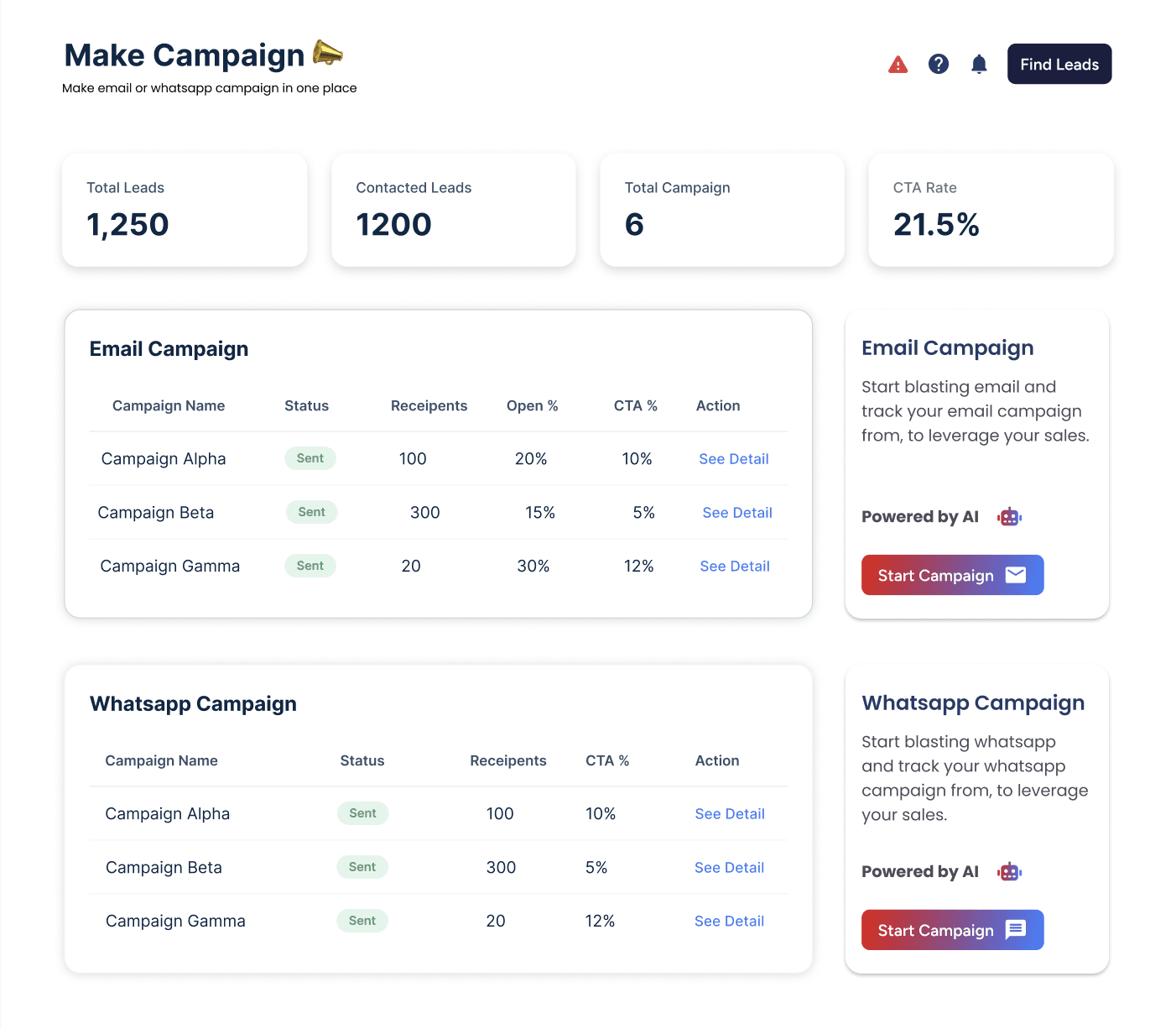 Create campaigns via WhatsApp Web or Email, personalize content, and schedule follow-ups automatically.