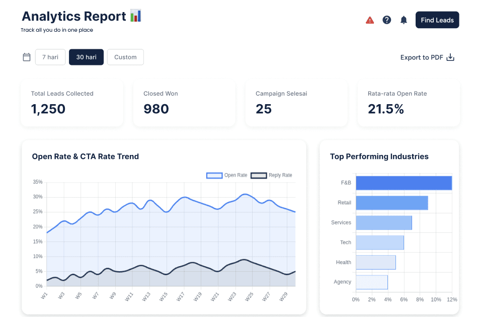 See your agency’s performance at a glance — from top industries to campaign and landing page insights powered by AI.