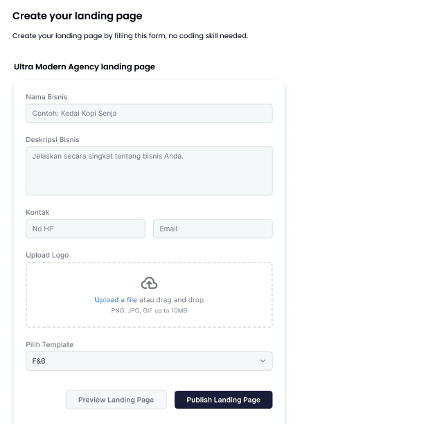 Pick a template, fill in your business info, and launch instantly — no coding required.